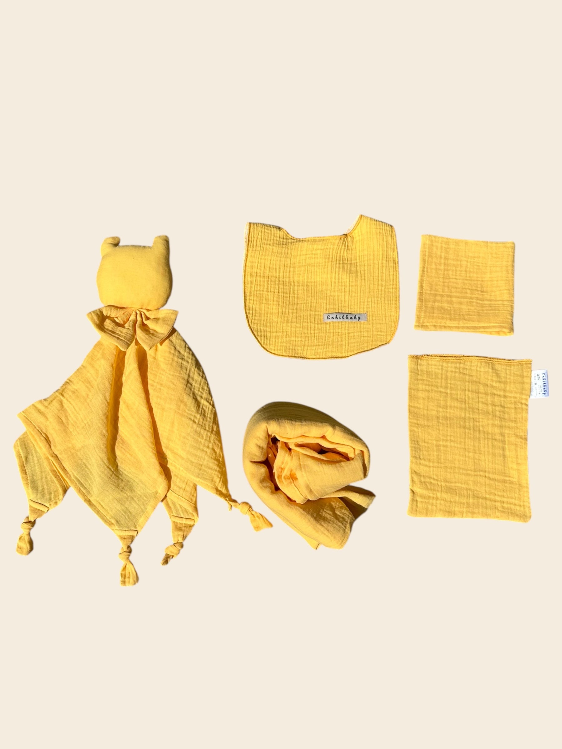 Şapka, eldiven, zıbın, patikli alt, önlük, ağız bezi, uyku arkadaşı, banyo kesesi ve müslin örtü içerir; hastane çıkışı ve günlük kullanım için idealdir.