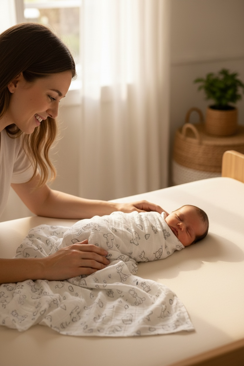 Yumuşacık bambu müslin dokusuyla bebeğinizi nazikçe sarar. Nefes alan yapısı sayesinde terletmez, dört mevsim rahatlıkla kullanılır.